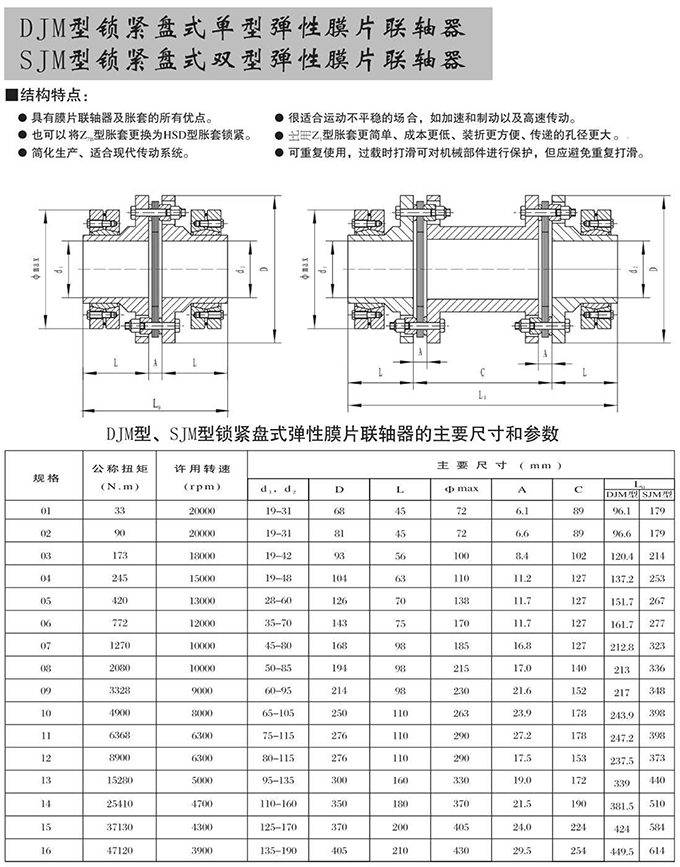 瑞安市寶德隆機(jī)械配件有限公司提供DJM型鎖緊盤(pán)式單型彈性膜片聯(lián)軸器SJM型鎖緊盤(pán)式雙型彈性膜片聯(lián)軸器具有拆裝方便,快速安裝等特點(diǎn),廣泛用于連接/固定輪轂孔和零件的軸,例如齒輪,錐齒輪,鏈輪,葉輪,凸輪,皮帶輪和飛輪等軸的聯(lián)結(jié)固定,咨詢(xún)電話(huà):18906872378