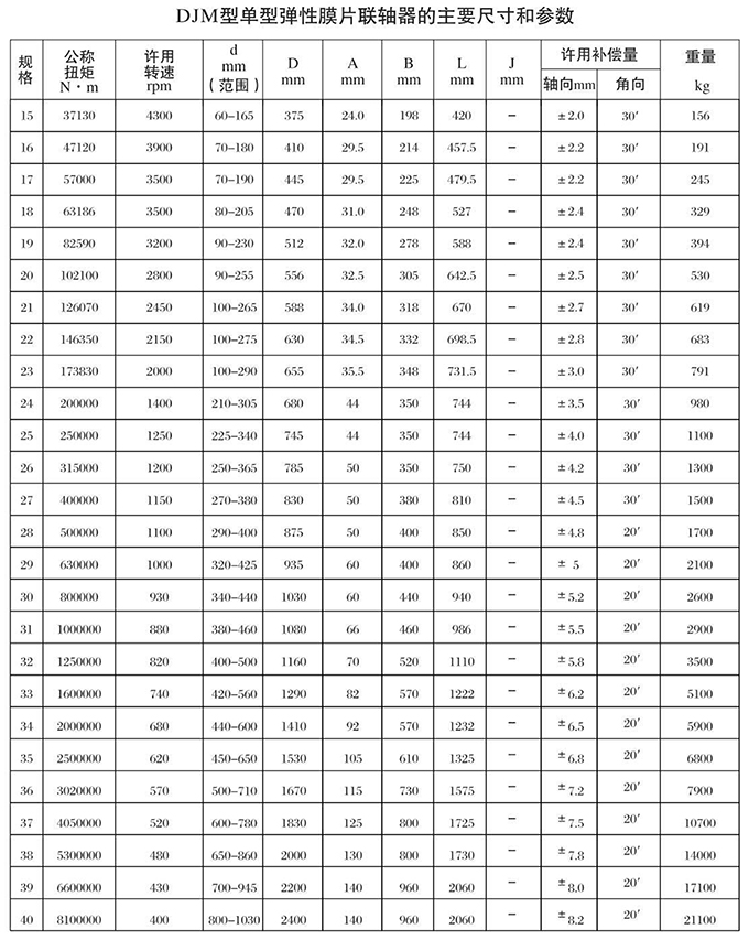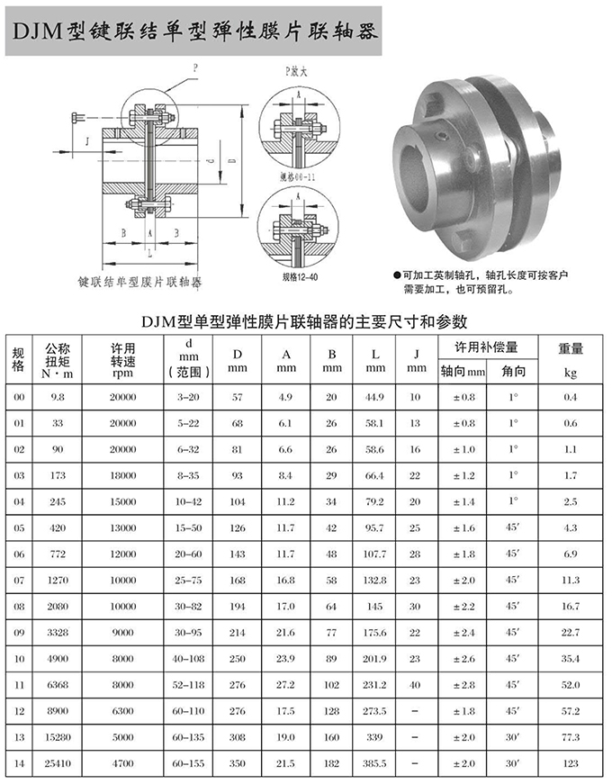 瑞安市寶德隆機械配件有限公司提供DJM型鍵聯(lián)結(jié)單型彈性膜片聯(lián)軸器具有拆裝方便,快速安裝等特點,廣泛用于連接/固定輪轂孔和零件的軸,例如齒輪,錐齒輪,鏈輪,葉輪,凸輪,皮帶輪和飛輪等軸的聯(lián)結(jié)固定,咨詢電話:18906872378